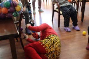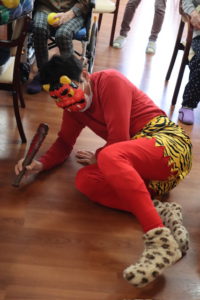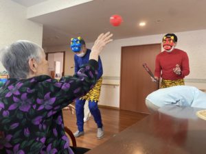 大豆でなく、カラーボールを力いっぱい投げて鬼退治です。