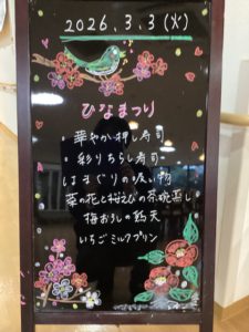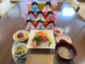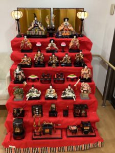 施設の玄関前には今年も堂々、7段飾りの雛人形が飾られました。